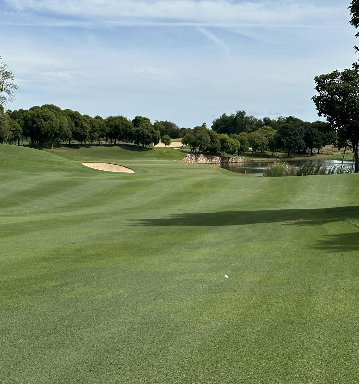 The first hole is an insight into what is to come on the rest of the course. It is a sweeping right to left dog leg par 5. The green is cut into one of the many water features.